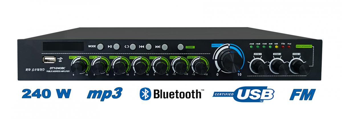 Moderní digitální (Class-D) rozhlasová ústředna malých rozměrů pro všestranné ozvučení se zabudovaným MP3 přehrávačem z USB a přehráváním MP3 přes BLUETOOTH.